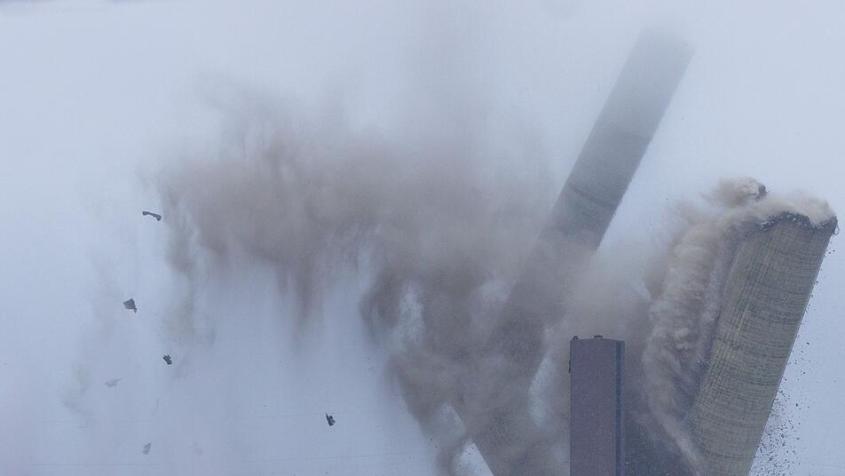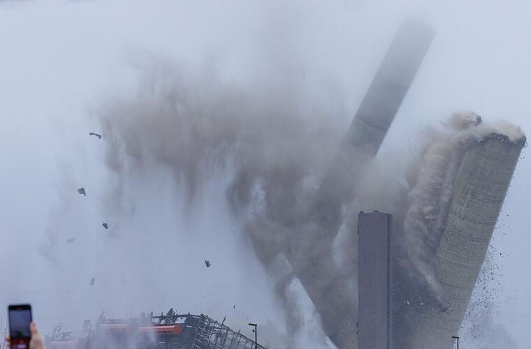 Ein lauter Knall und viel Staub: In Ibbenbüren im nördlichen Westfalen ist der 275 Meter hohe Schornstein des ehemaligen Steinkohlekraftwerks gesprengt worden. Die zahlreichen Schaulustigen konnten allerdings nur einen Teil des Spektakels sehen, denn die obere Hälfte des Schornsteins war von Nebel und Wolken verdeckt. Mit der Sprengung ist die letzte bis Niedersachsen zu sehende Landmarke des früheren RWE-Kraftwerks verschwunden.