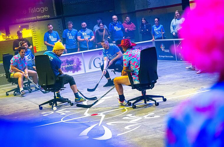 Rund 500 Sportlerinnen und Sportler rollen durch die Halle. «Das ist schon der Wahnsinn», sagte Initiator Jens Fislage. Angefangen habe alles mit einem «kleinen Gag»: Der Inhaber eines Büromöbelhandels aus Ritterhude (Landkreis Osterholz) wollte seine Firmenfeier mit einem Hockey-Turnier mit Bürostühlen auflockern. Die eigene Lagerhalle wurde schnell zu klein, inzwischen treten Mannschaften aus ganz Deutschland gegeneinander an.