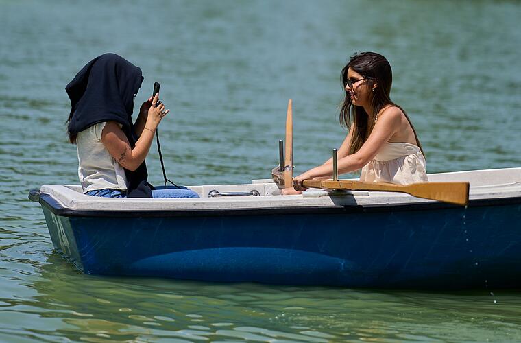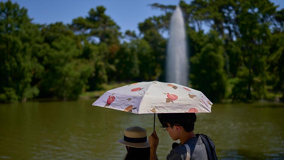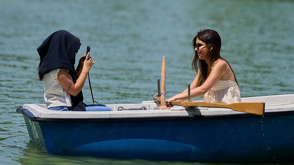 Trotz der Hitze mit Temperaturen von bis zu 39 Grad zog es viele Madrilenen und Touristen auf die Straßen der spanischen Hauptstadt. Unter anderem um den Teich im Retiro-Park suchten viele Abkühlung. Manche schützten sich vor der Sonne mit Regenschirmen oder legten sich T-Shirts über den Kopf.