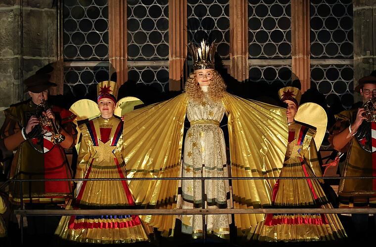 Der weltberühmte Nürnberger Christkindlesmarkt hat begonnen. Mit dem traditionellen Prolog eröffnete das Nürnberger Christkind, Nora Falk, diesen am frühen Abend. Etliche Schaulustige lauschten auf dem Hauptmarkt dem mehrstrophigen Gedicht, das die Schülerin in einem engelsgleichen Kostüm mit goldenen Flügeln von der Empore der Frauenkirche sprach.
