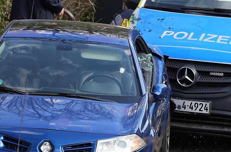 In der Straße stand ein blaues Auto, davor und dahinter jeweils ein Polizeifahrzeug. In der Windschutzscheibe des blauen Autos war ein Loch zu erkennen. Das Fenster auf der Fahrerseite war kaputt.
