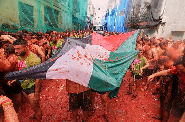 Die «Krieger» waren teils mit Tauchermasken ausgestattet. Einige trugen aus Solidarität mit den leidenden Menschen im Gazastreifen Palästina-Fahnen. Schon kurz nach Beginn der «Schlacht» um 12.00 Uhr wurden der Hauptplatz und die Straßen Buñols rund 40 Kilometer westlich der Metropole Valencia von einer matschig-roten Brühe überzogen.