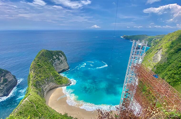 Das 180 Meter hohe Bauwerk sollte Touristen künftig in gläsernen Kabinen zum berühmten «T-Rex-Felsen» auf der kleinen Nachbarinsel Nusa Penida hinabfahren lassen. Die Klippen am Kelingking Beach formen - von oben betrachtet - einen riesigen Dinosaurierkopf mit geöffnetem Maul. Auf Instagram und in anderen sozialen Netzwerken kursieren Hunderttausende Bilder des ikonischen Motivs unter Hashtags wie #kelingkingbeach und #trexcliff.