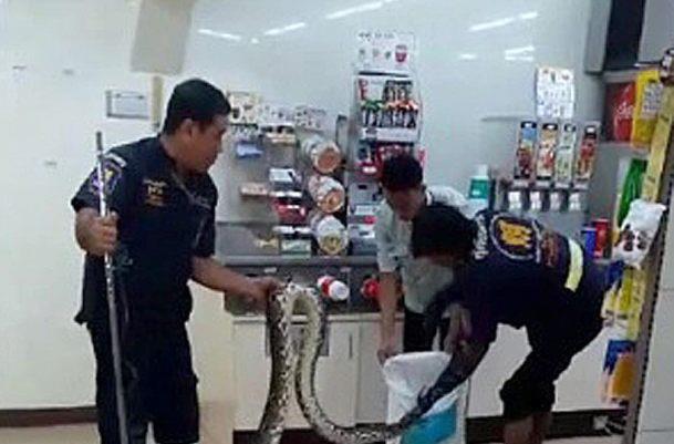 "Nur schnell einkaufen gehen", dachten sich sicher ein paar Thailänder am Wochenende in Chonburi. Jedoch erwartete die Kunden eine vier Meter lange Python, die sich vor einem Kühlschrank breit gemacht hat.