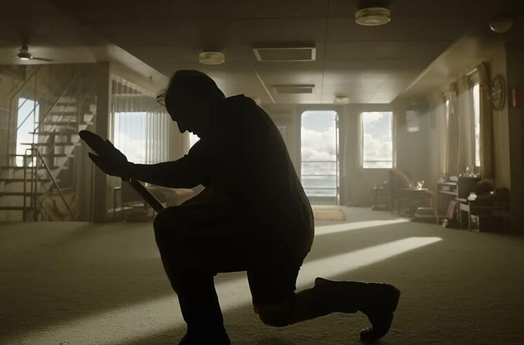 In einem ersten Trailer tänzelt der Schauspieler kaum wiederzuerkennen in übergroßen Cowboy-Stiefeln durch ein Wohnhaus und auf dem Geländer eines Stegs - immer eine Schaufel in der Hand. In der Silhouette schimmert das schüttere Haupthaar.