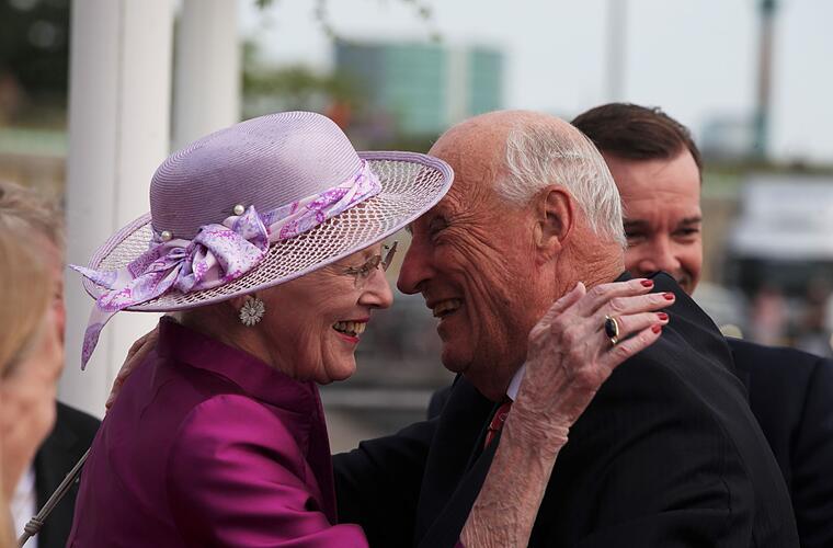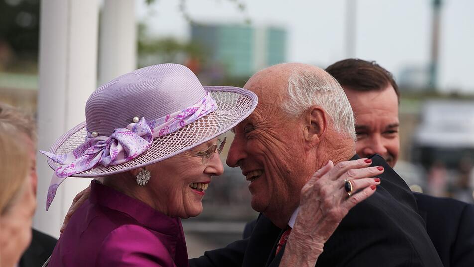 Besuch unter skandinavischen Freunden: Norwegens Königspaar Harald V. und Sonja ist zu einem zweitägigen Staatsbesuch in Dänemark eingetroffen. Das 86 Jahre alte Staatsoberhaupt und seine 85-jährige Gattin kamen am Donnerstag mit dem Königsschiff «Norge» in Kopenhagen an, wo sie Dänemarks Königin Margrethe II. (83) am Kai begrüßte. Der auf Krücken gehende Harald stolperte auf den Stufen kurz vor Margrethe, ehe ihm schnell wieder aufgeholfen wurde. Der Monarch war wenige Sekunden später erneut auf den Beinen und fing das kleine Missgeschick offenbar mit einem Späßchen auf. Er und Margrethe lachten herzlich, als sie sich umarmten.