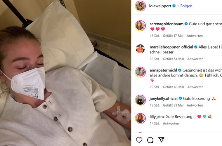 "Hatte mir meinen Sommerurlaub etwas anders vorgestellt", schrieb die 29-Jährige auf ihrem Instagram-Profil zu einem Selfie, auf dem sie mit geschlossenen Augen und Mundschutz zu sehen ist. Außerdem hat sie einen Zugang an ihrem Arm angebracht bekommen. In einem Video, das sie ebenfalls auf Instagram gepostet hat, geht Weippert weiter ins Detail, als sie "liebe Grüße aus dem Krankenhaus mit 10 cm langer Spritze in der Wirbelsäule" sendet. "Drückt gerne die Daumen, damit meine Werte nicht schlechter werden und ich bald wieder gesund sein darf", bittet sie.