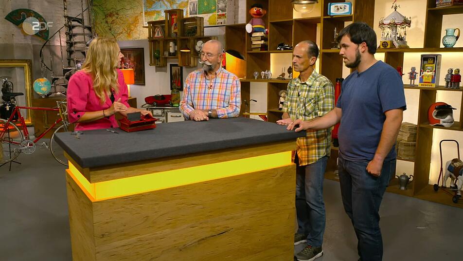 Als Papa Lorenz die Marke der Schatulle nannte, dozierte Daniel Meyer: "Leipzig, das war ein Zentrum für Spieluhren, für Musikautomaten, und so weiter ..." Walter Lehnertz stieg mit seinem bekannten "Waldi" ein: 80 Euro. "Das ist die Kiste auf jeden Fall wert", sinnierte er. Benjamin Leo Leo bot 100 Euro. Susanne Steiger bließ außen vor.