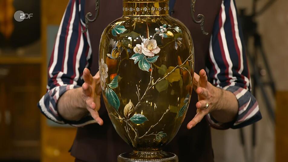 "Ich gehe davon aus, dass das keine Abziehbildchen sind", scherzte Horst Lichter angesichts der Bemalung. "Handgemalt", präzisierte der Experte. Das gelbgefärbte Glas zierte Emaille-Malerei. Der Glaskorpus steckte wiederum in einer Montur aus Metall. "Reste von Vergoldung" entdeckte Colmar Schulte-Goltz am Messing-Standfuß. Auch die Montur oben war dereinst vergoldet. Letztere bestand aus Zinkguss.