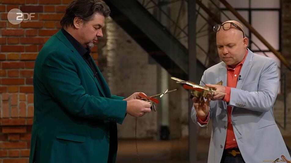 Was er außer dem Alter noch herausfand: "Die waren vor dem Ersten Weltkrieg Verkaufsschlager." Aufgrund der Ketten dachte Gert, "dass das früher ein Kettenkarussell war". Das konnte der Experte nicht bestätigen, denn die Löcher wurden selbst gebohrt. Auch sonst wiesen die Blechflugzeuge Kratzer, Dellen und Rost auf.
