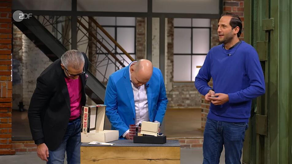 Würde der Wunschpreis von 100 Euro für das alte Kinderspielzeug von Sven Deutschmanek bestätigt werden? Ja! Er nannte 100 bis 120 Euro, denn: "Das Gute ist, dass wir diese so große Anzahl an Filmen dabeihaben." Die Händler waren entzückt beim Anblick des Mini-Projektors: "Sie bringen das Kino ins Fernsehen", staunte Benjamin Leo Leo ebenso erfreut wie Julian Schmitz-Avila: "Mein lieber Scholli! 'Dick und Doof auf der Autobahn', 'Tweety in Nöten' - das sind schon Sachen, die ich gerne gesehen hätte."