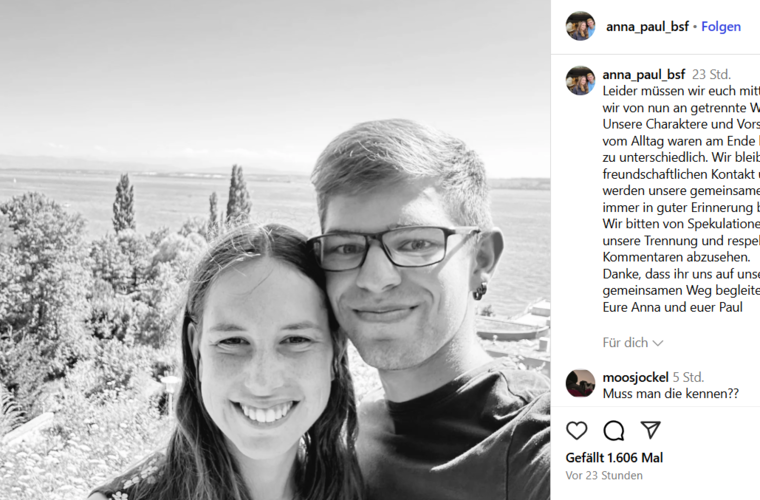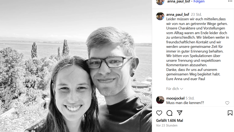 Auf Instagram teilten Paul und Anna einen Post auf ihrem gemeinsamen Kanal. "Leider müssen wir euch mitteilen, dass wir von nun an getrennte Wege gehen", hieß es im Statement. "Unsere Charaktere und Vorstellungen vom Alltag waren am Ende leider doch zu unterschiedlich", fügten sie noch hinzu.