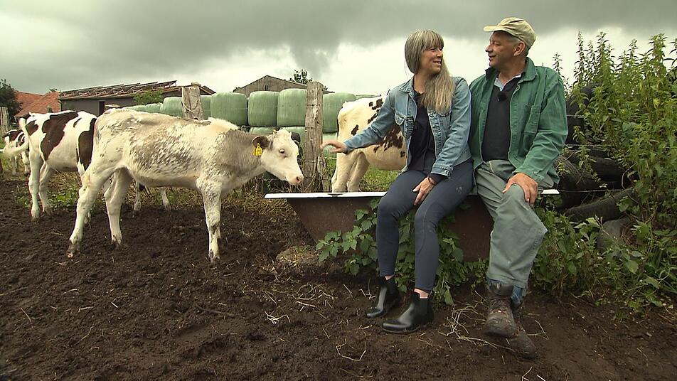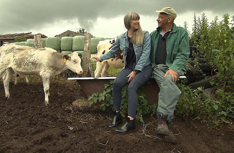 Nach dem gemeinsamen Frühstück geht es für die beiden raus auf Johanns Hof. Dort möchte er Katja seine Kälber und seine Hühner zeigen. Katja darf auch direkt mit anpacken, Kälber füttern und die Eier der Hühner einsammeln. Dort kommt es zum nächsten Schock.