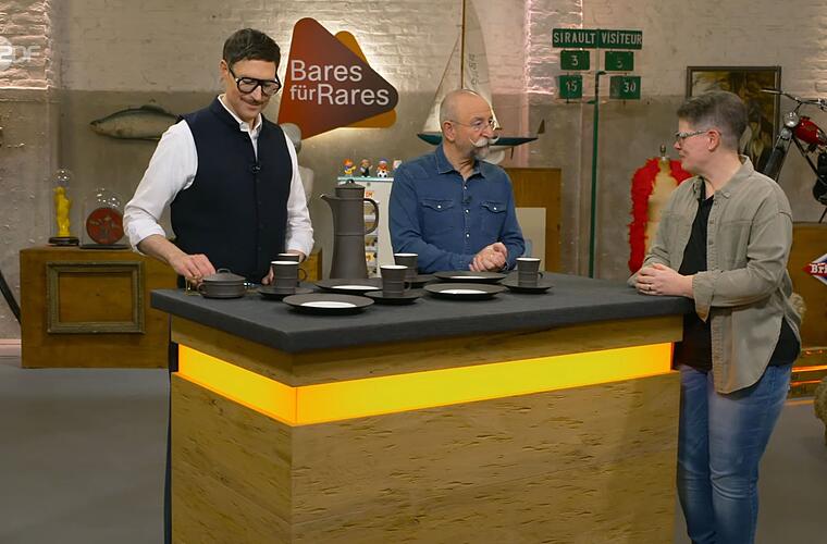 "Sogar noch früher", erwiderte Petra. Jens Quistgaard habe das Design Mitte bis Ende der 1950er-Jahre designt und es Ende der 50er- oder Anfang der 60er-Jahre auf den Markt gebracht, zitierte die Verkäuferin den Experten. "Was haben wir da? Porzellan?", wollte Elke Velten wissen. "Es ist ein ganz besonderes, raues Steingut", pries die Verkäuferin ihre Ware an. "Aber die Flächen, die mit Lebensmitteln in Kontakt kommen, sind extra glatt gelassen", erklärte sie.
