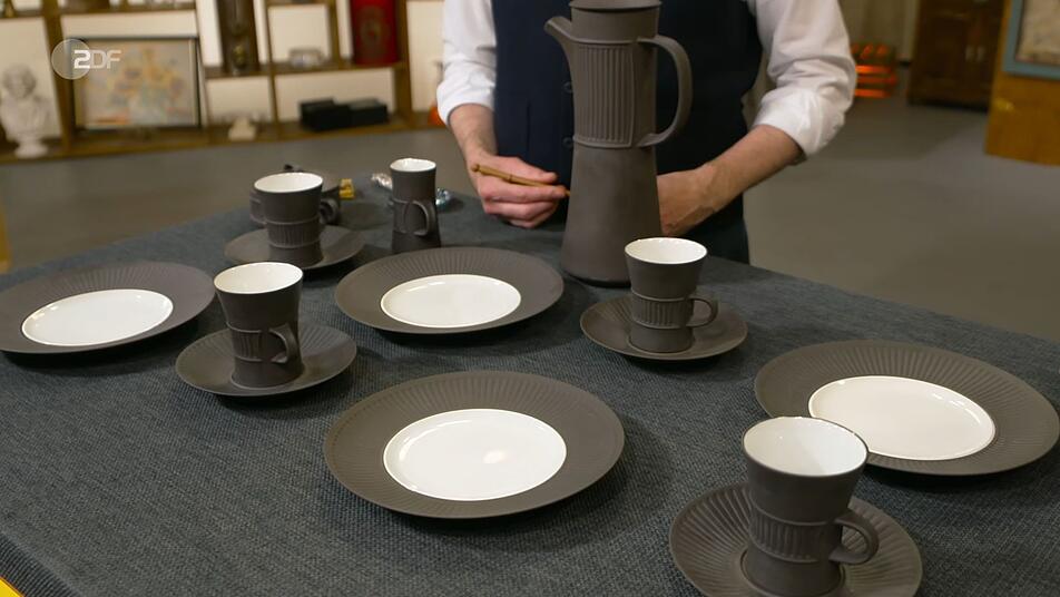 Das mache das Service "sehr gebrauchsfreundlich", erklärte der Experte. Er wusste: "Heutzutage sind wir daran gewöhnt, dass sich die Außenpartie rau anfasst, aber in der Zeit als dieses Service neu war, war das etwas sehr Ungewöhnliches." "Dieses Design sieht relativ neuartig aus, aber es ist erstaunlich alt", fuhr Colmar Schulte-Goltz fort. "Ach? Jetzt bin ich gespannt!", kommentierte der Moderator. Die Auflösung: In dieser Variante wurde das Kaffeeservice von 1958 bis 1964 produziert.