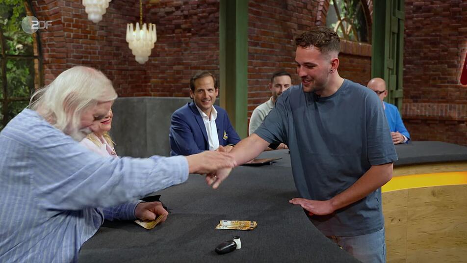 Steve Mandel - Antiquitätenhändler und Musiker - entlockte der Konzertina erstaunlich passable Töne. Für sein spontanes Konzert auf dem alten Instrument gab es sogar Applaus von seinen Kollegen: "Bravo", rief Elke Velten ganz begeistert, auch Benjamin Leo zeigte sich beeindruckt von dem "Wahnsinn" und Julian Schmitz-Avila lachte: "Ich liebe dich!"