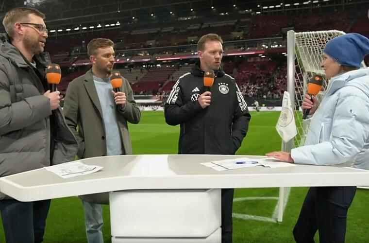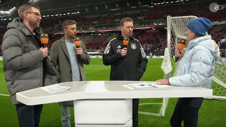 Am Ende war alles gut. Am Anfang auch. "Und Per und Chris sind auch dabei - juhu!", begrüßte Katrin Müller-Hohenstein ihre Experten Per "Eistonne" Mertesacker und Christoph "Ist hier das Finale?" Kramer. Sie standen zitternd da im Leipziger Stadion - zitternd vor Kälte und vor Muffe, es könnte doch was schiefgehen mit der Quali für Deutschlands 21. WM-Teilnahme. Der Verdacht beschlich auch die mit blauem Mützchen und weißer Daunenjoppe als Schlumpfinchen gewandete KMH. Jedenfalls konfrontierte sie Bundestrainer Julian Nagelsmann im Pre-Game-Interview mit der provokanten Frage: "Können wir bei der WM um den Titel mitspielen?" Nagelsmann blieb so cool wie die Temperaturen: "Es gibt keine Regel, die das verbietet."