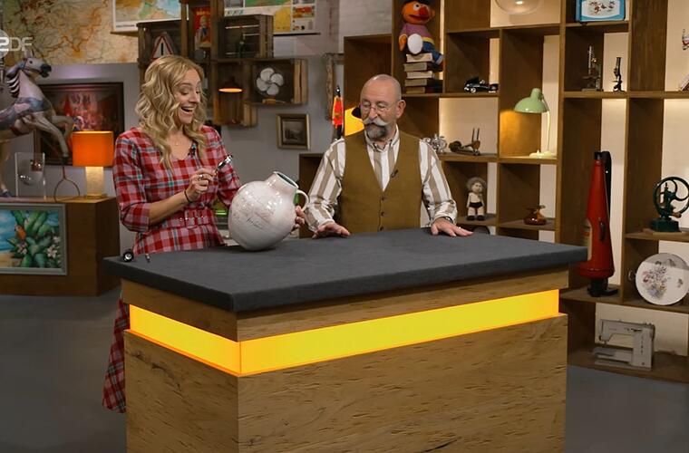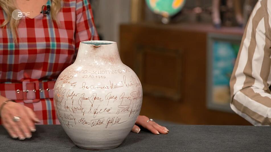 Dort war schließlich auch der Krug entstanden, versehen mit eingebrannten Unterschriften der Spieler. Der Moderator staunte: "Dort sind die Spieler drauf von der WM?" - "Nicht von der WM, aber von einem Qualifikationsspiel", klärte Annika Raßbach auf. Lichter gab offen zu: "Das Dingen hätte ich im Leben nicht für Fußballfans einsortiert." In den 1950er- und 1960er-Jahren seien solche Tonkrüge laut Expertin absolut beliebt gewesen.