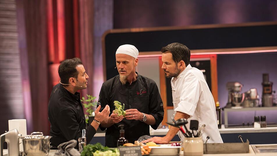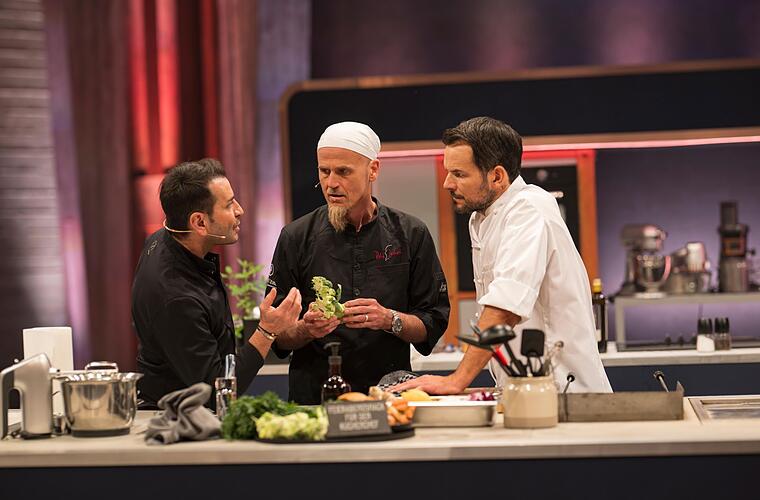 Da kam sie wieder, die Krux von Henssler & Co.: Im Quiz mussten sie einen Zwei-Minuten-Verlust für die Finalzeit abwenden - und vergeigten es mal wieder. "Das sind wir gewohnt", setzte Güngörmüş auf Galgenhumor, aber die Luft wurde dünner und die Stimmung aufgeheizter. Merkte Güngörmüş gleich beim nächsten Kochgang, als er beim Schälen von Brokkolistilen angeblich zu behäbig agierte. "Da musst du mehr schälen, Mensch. Du faule Sau", raunzte ihn Henssler an. Güngörmüş versuchte, des Teamchefs Laune zu glätten. "Das Fleisch ist super. Kann ja nur so sein, hat ja Steffen gemacht", zirpte er und lachte gleich: "Jaha, schleimischleim."
