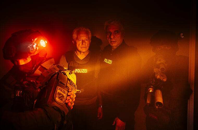 Szenenfoto aus "Tatort: Unvergänglich": (v. li.) Kriminalhauptkommissar Ivo Batic (Miroslav Nemec) und Kriminalhauptkommissar Franz Leitmayr (Udo Wachtveitl) betreten mit den SEK‑Beamten ...