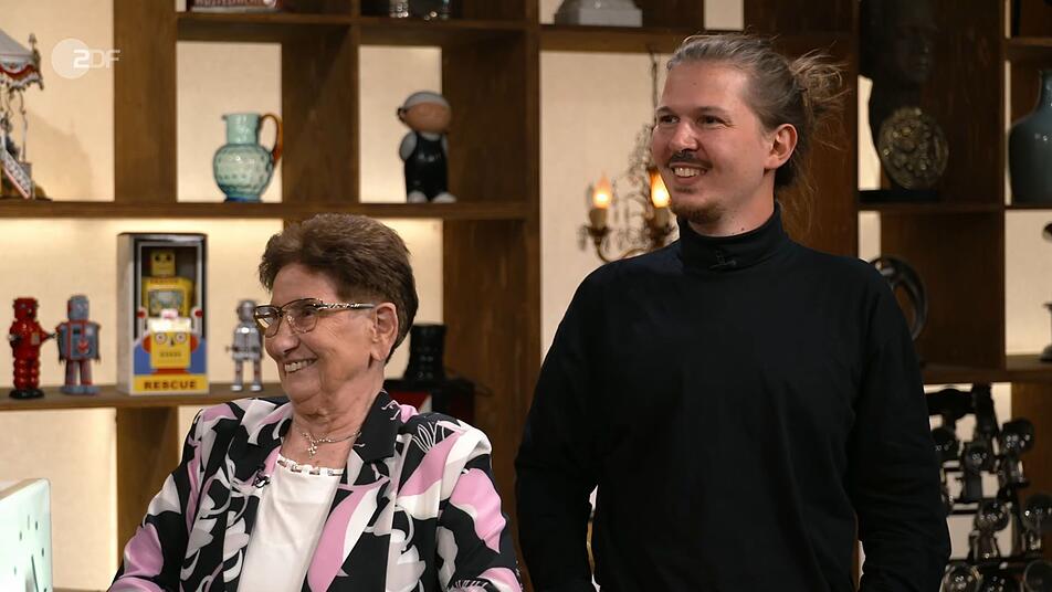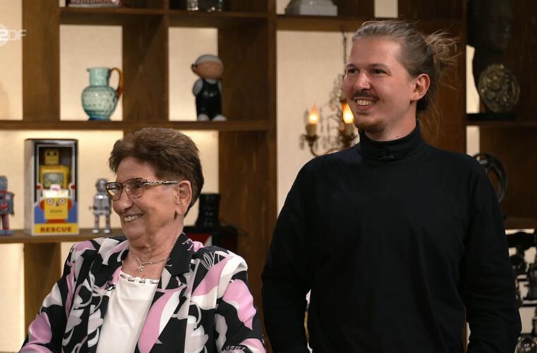 Oma Gerlinde aus Pfungstadt und ihr Enkel Moritz aus Freiburg wollten eine Leuchtreklame loswerden. "Aber die gehört nicht dir, du bist nur hier zum Aufpassen auf ihn", fragte Lichter. "Ja, ich passe auf, dass er das Geld gut heimbringt", erwiderte die Großmutter schelmisch. "Eine schöne Werbung mit Beleuchtung", fand Horst Lichter beim ersten Blick auf das Mitbringsel. Bei der Begrüßung schepperte es und er fragte sich: "Ui, was ist passiert?" Der Gehstock der Dame war umgefallen. "Junger Mann, heb mal auf", bat Lichter den Enkel.