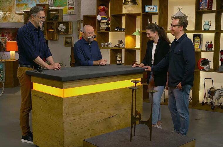Die drei Elemente des Leuchters lassen sich mit einer Schraube flexibel verstellen. "Das hat ihn für euch aber offenbar nicht attraktiver gemacht", merkte Kümmel augenzwinkernd an. Das Paar lächelte - ein Verteidigungsversuch blieb aber aus. Dabei stammte das Stück sogar aus einer traditionsreichen Kunstschmiede, gegründet 1912.