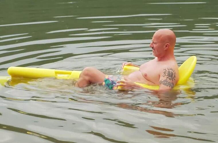 Wieder an Land schildert er das Problem: "Der Mann hat ja Klöten. Und die sind in einem Behältnis. Und je älter du wirst, desto größer wird das Behältnis, wo die Klöten drin sind." Dann passiert es eben: "Das Behältnis hat sich einmal um den 'Subalo' geschlungen und ich bin direkt auf die Klöten." Er unterstreicht die Schilderung mit einem Klatschgeräusch.