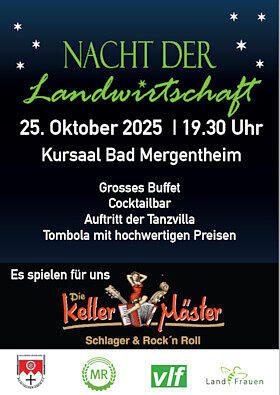 Am Samstag, den 25. Oktober 2025, öffnet der Kursaal Bad Mergentheim (Lothar-Daiker-Straße 2) seine Türen zur zweiten Nacht der Landwirtschaft. Ab 18:30 Uhr sind die Gäste herzlich willkommen, bevor das abwechslungsreiche Programm um 19:30 Uhr offiziell beginnt.