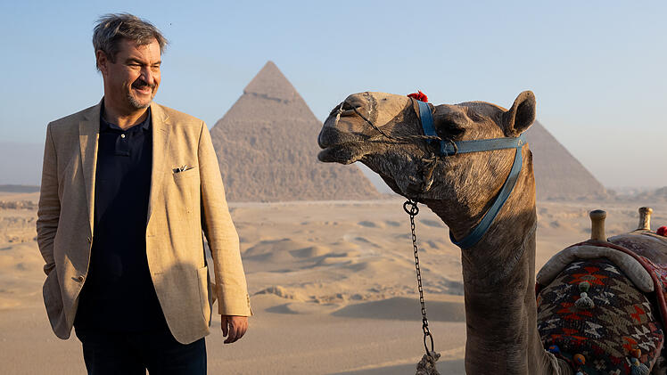 Aufsteigen will Markus Söder nicht. Weder auf Valentino noch auf Casanova oder Micky Maus. Als der bayerische Ministerpräsident den Sonnenaufgang zum Tag der Deutschen Einheit unweit der Pyramiden von Gizeh begrüßt, sind die drei Kamele nicht weit. "Nein, ich will nur daneben stehen", sagt der CSU-Chef zum Führer der offenkundig nur für seinen Besuch bestellten Wüstenschiffe. Abgesehen von Söder und seiner Delegation ist das imposante Weltwunder zu dieser frühen Stunde menschenleer.