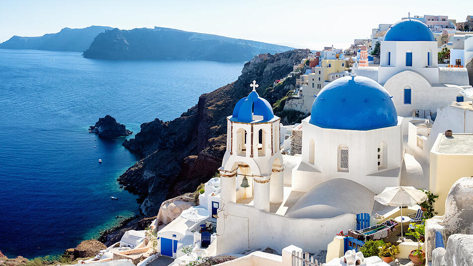 Santorini (Griechenland): Die griechische Insel ist berühmt für ihre weißen Häuser mit blauen Kuppeln und beeindruckende Sonnenuntergänge. Perfekt für romantische Auszeiten.
