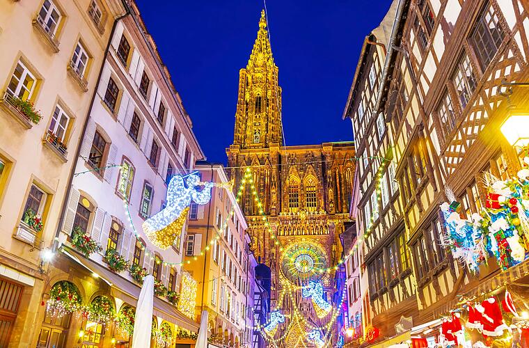 Der Straßburger Weihnachtsmarkt, bekannt als Christkindelsmärik, ist der älteste Weihnachtsmarkt Frankreichs (seit 1570) und einer der ältesten in Europa. Mit über 300 Ständen an 12 verschiedenen Standorten ist er auch einer der größten Weihnachtsmärkte des Kontinents - kein Wunder also, dass Straßburg als "Weihnachtshauptstadt" bezeichnet wird und vor dem Fest jährlich Millionen von Besuchern anzieht. Die Altstadt Straßburgs verwandelt sich zur Adventszeit in ein märchenhaftes Ensemble aus historischen Fachwerkhäusern, der imposanten Kathedrale und einer stimmungsvollen Beleuchtung. Besonders hervorzuheben ist die dichte historische Kulisse, die von engen Gassen, kleinen Plätzen und viel Holz geprägt ist.