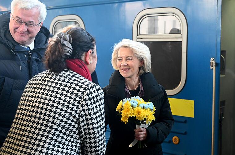 Unterstützung bekam Selenskyj von EU-Kommissionspräsidentin Ursula von der Leyen und Ratspräsident António Costa, die gemeinsam mit mehreren europäischen Staats- und Regierungschefs zum Jahrestag nach Kiew gereist waren. Von der Leyen sagte, der Besuch solle zeigen, dass Europa auch durch diesen harten Winter hindurch finanziell und militärisch unerschütterlich zur Ukraine stehe.