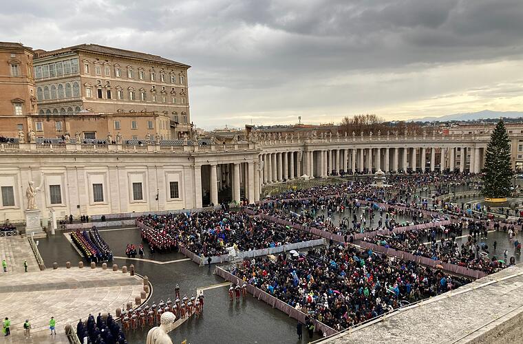 Als der Papst am Donnerstag um 12.00 Uhr auf den Balkon des Petersdoms trat, brach Jubel unter den Menschen aus, die bei Nieselregen gewartet hatten. Kurz zuvor war er mit dem Papamobil über den Platz gefahren, um die Besucher zu begrüßen. Rund 26.000 Menschen kamen laut Vatikan auf den Petersplatz, wie die Nachrichtenagentur Ansa berichtete.