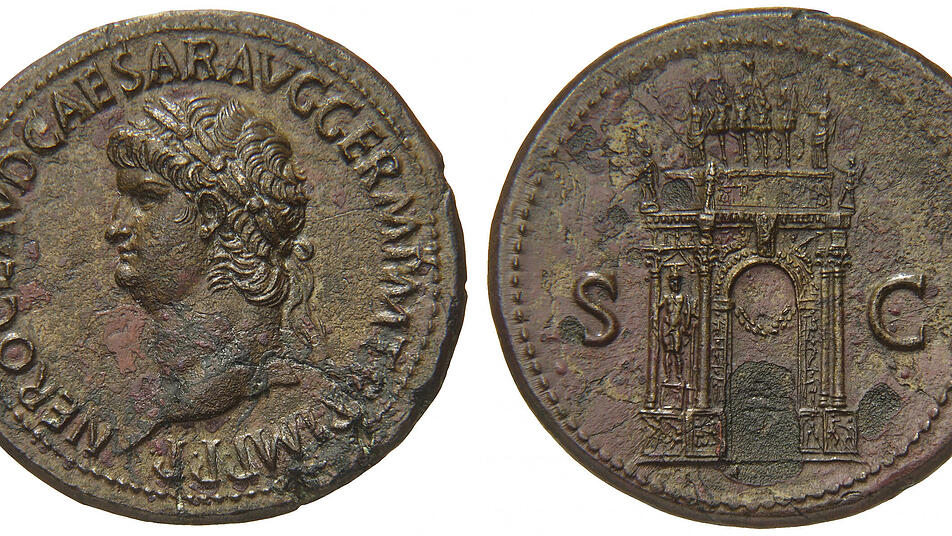 Bronzemünze (Sesterz) des Nero mit dem Porträt des Kaisers auf der Vorderseite und einem Triumphbogen auf der Rückseite – möglicherweise dem anlässlich des Parthersieges Corbulos errichteten Bogen
