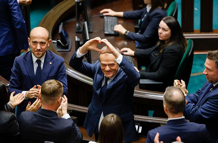 Als Donald Tusk nach fast acht Wochen Wartezeit endlich am Ziel ist, hält er die Hände in die Höhe und formt mit Daumen und Zeigefingern ein Herz. Gerade hat das Parlament den früheren Oppositionsführer mit großer Mehrheit zum künftigen Regierungschef gewählt. Während Tusk spricht, kämpft oben auf der Empore der Friedensnobelpreisträger und frühere polnische Präsident Lech Walesa mit Tränen der Rührung.